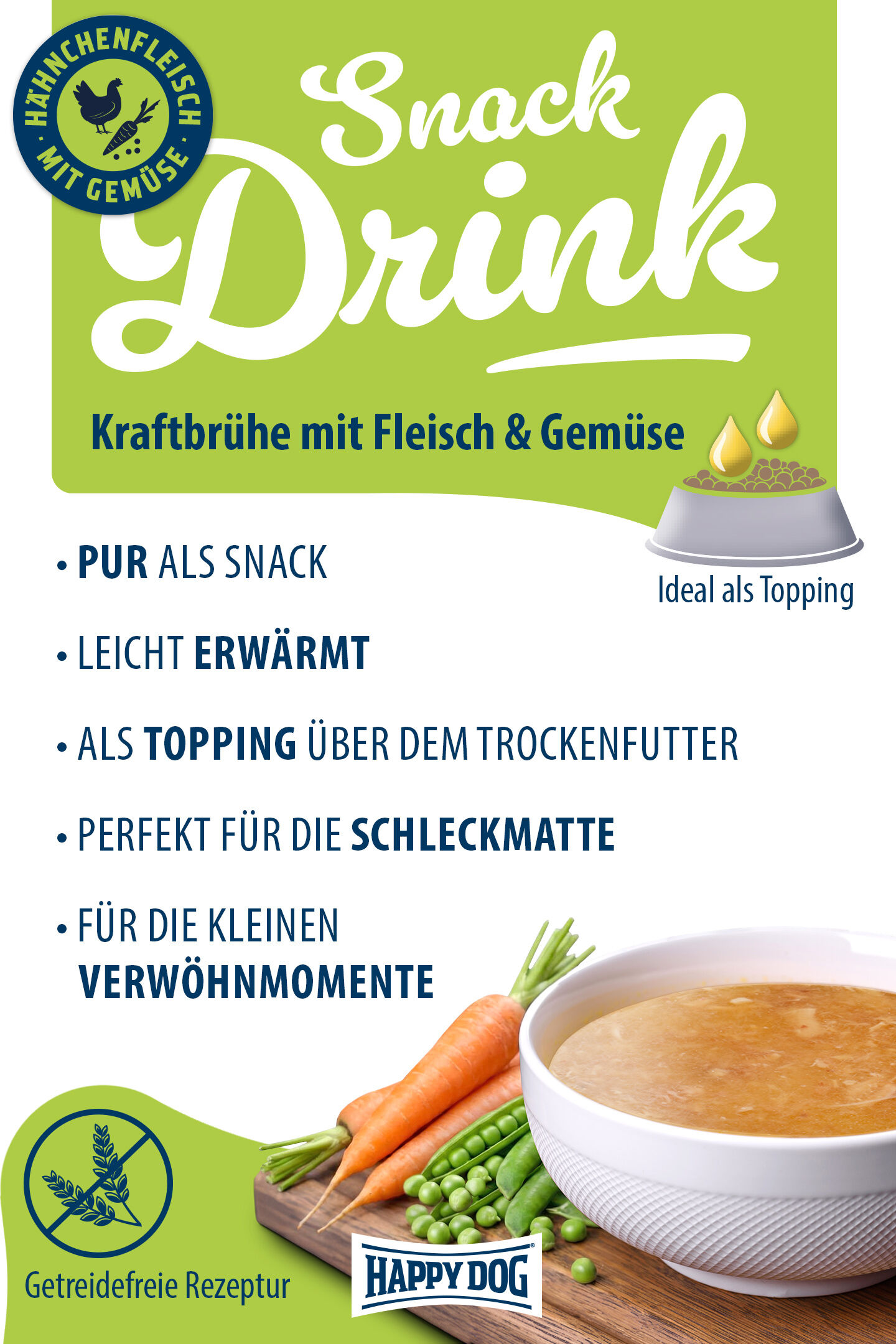 Viele Hundebesitzer kennen das Problem: Der Hund trinkt zu wenig oder nimmt hauptsächlich Flüssigkeit über seine Nahrung auf. Der Happy Dog Snack Drink mit Hähnchenfleisch und Gemüse ist genau für diese Situationen entwickelt worden. Unser aromatischer Flüssigsnack vereint kräftige Hühnerbrühe mit feinen Zutaten wie Hähnchenfleisch, Erbsen und Karotten. So wird jede Mahlzeit im Handumdrehen zum leckeren Genussmoment und dein Hund dazu animiert, mehr Flüssigkeit aufzunehmen.