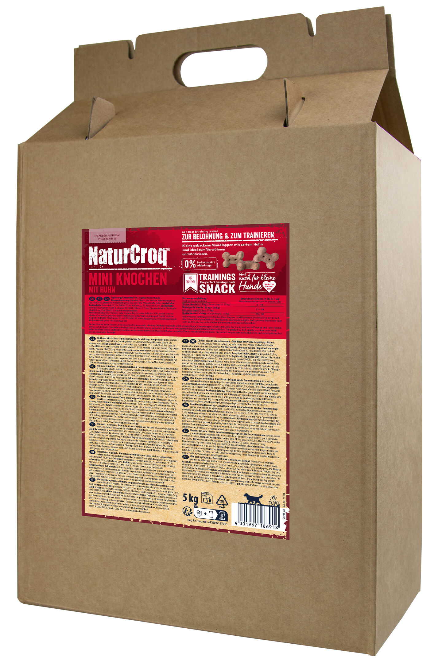 Somit sind die NaturCroq Mini Knochen mit Huhn für Hunde aller Rassen und Größen geeignet. Für kleine Hunde oder zum Probieren ist die 500 g Packung ideal, während für größere Hunde oder diejenigen, die bereits auf den Geschmack gekommen sind, unser 5 kg Vorratspack optimal ist.